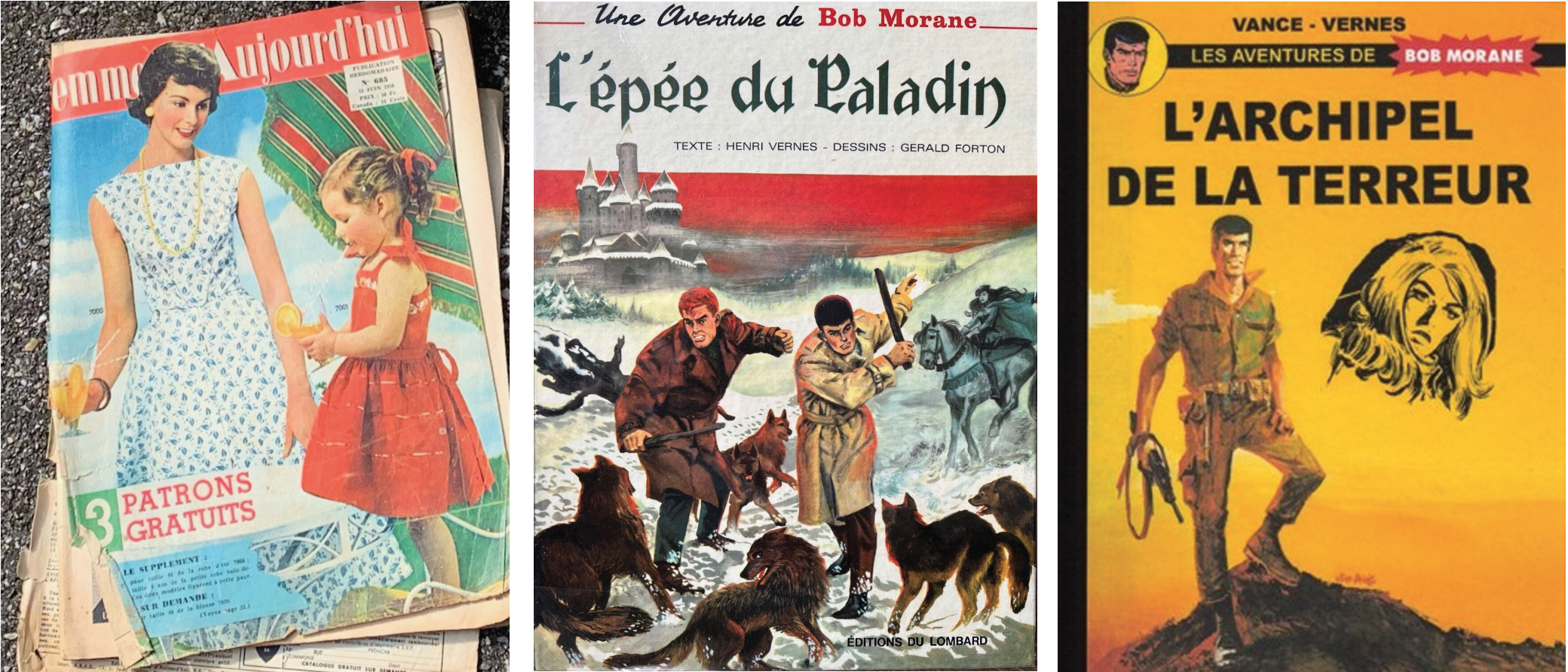 L’avant-dernière page était celle qui mettait en scène les exploits de Bob Morane. Je dévorais ces pages sans me questionner, sans réaliser qu’un auteur et une main humaine se trouvaient derrière elles. Je n’y réfléchissais pas, tant ces aventures me semblaient entrer naturellement dans notre maison. Contrairement à Jean-Luc Heimburger, je n’ai pas eu de BD, ni de livre de poche sur Bob Morane. Si Bob Morane m’a tant marquée, c’est uniquement par le biais de ces parutions dans Femmes d’aujourd’hui, au rythme d’une page par semaine, avec le cœur en suspension dans l’attente de la suivante. Son auteur s’appelle Henri Vernes. Ce romancier belge avait fait paraître les aventures de Bob Morane en romans dans les années 50. C’est sur la demande, à partir de 1959, du magazine que ces livres devinrent des BD.