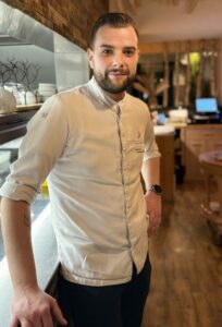 Côté déco : le bleu profond contraste avec le bois et l’ensemble entre en résonance avec la cuisine de Jérôme Paquin; une modernité qui revisite le terroir alsacien. Il exalte ses souvenirs d’enfance à travers ses coquillettes-jambon, qu’il prend soin d’anoblir avec de la truffe, dissimulant un œuf cuit à 65°C rehaussé d’une émulsion d’oignons rôtis. Ses poireaux, en différentes textures, sont une palette de verdure, finement travaillés de la tête au pied, crème de fromage blanc aux agrumes et poutargue, pour une touche de salinité. Plus audacieux encore, son terre-mer marie la vigueur du bœuf Wagyu japonais escorté de la langue confite, à la délicate langoustine marinée à cru.