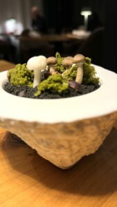 Pour les réunir dans leur opposition, la compression de pommes de terre aux algues. Témoin de loin, la tartelette d’oignons caramélisée, gonflée comme un macaron, charnue et goûteuse, d’une belle puissance qui va marquer les esprits. Son dessert incontournable dresse comme un chef-d’œuvre les champignons et myrtilles des sous-bois, dans une promenade sur un sentier végétal sur une mousse au thé matcha. La quenelle de glace myrtille brille d’un noir violacé, parfait, pour rafraîchir la composition florale. Ce mois-ci Jérôme Paquin est intronisé chez les Maîtres Cuisiniers de France.