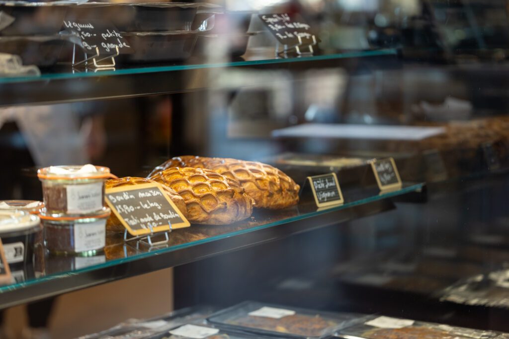 Une immense cloison à demi vitrée, de style industriel, sépare la cuisine de l’épicerie. Dans cette dernière, le tout venant trouvera Muriel, qui encaisse, approvisionne, renseigne. Quelques plats de la partie traiteur sont disposés à côté du comptoir.