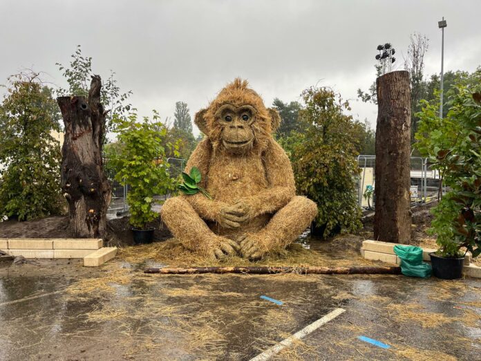 Ainsi, le premier chapiteau accueille un ciel fleuri du meilleur ouvrier de France Benoît Saint-Amant. Le deuxième grand jardin présente une scénographie autour du feu, de la glace et de l’eau. « Nous avons fait un singe en paille, c’est la tête d’affiche. Et dans ce chapiteau, Sur les traces des géants, on a créé des sculptures de mammouths et d’un tigre à dents de sabre, en foin », explique Benoit Dutherage, le sculpteur en chef.