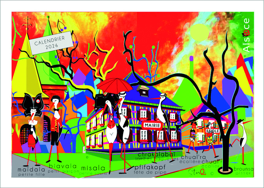 Des volatiles qui sont devenus ses personnages, sa patte. L’une de ses spécialités, ce sont donc des cigognes qui illustrent des mots et expressions en alsacien inscrits juste en dessous. Ainsi, après avoir dessiné avec ses petits-enfants, il n’a jamais arrêté.