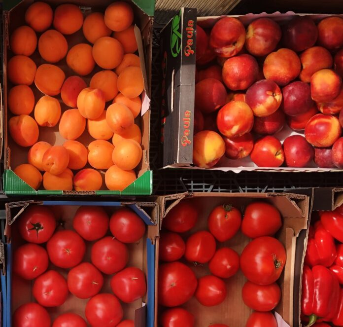 La dame du marché dit que ce sont des fruits du jardin, été tardif… Tomates japonaises, c’est l’espèce la meilleure… On se dit que si cela a été cultivé dans le potager derrière la ferme, c’est forcément bien bon, et probablement sans produits chimiques. Nous avons tous envie de faire confiance au sourire de la fermière ! Ses couleurs sont très belles, et c’est cela qui donne envie !