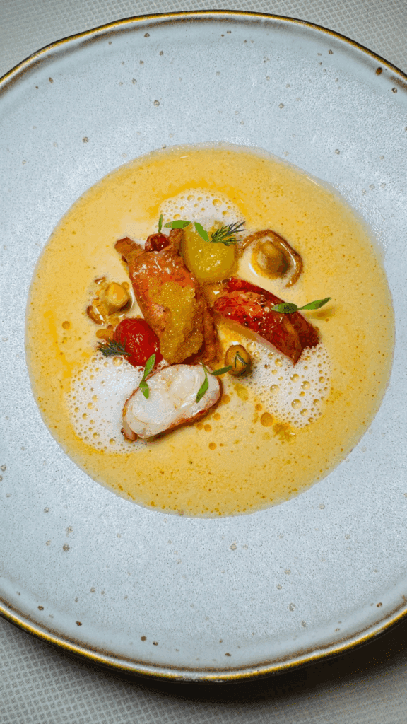 Les menus surprises, proposés en quatre ou six services, s’adaptent aux goûts et aux allergies, mais laissent toujours transparaître la même justesse : celle d’une cuisine vibrante, subtile, sincère. Le Tom Yam de homard bleu au lait de coco et galanga dialogue avec le pigeonneau des Vosges au curry rouge, tissant un lien poétique entre l’Alsace et la Thaïlande, entre l’exotisme et le terroir. Les plats signatures demeurent : la soupe Tom Yam, le homard bleu ou encore le crabe mou en tempura, pêché pendant sa mue et servi avec une mayonnaise allégée à l’ail noir et au citron. Ce mets d’une rare délicatesse, fragile et fugace, exige une attention constante, à l’image de leur art, entre patience et précision. Dans la lumière dorée de la salle, le raffinement thaï se mêle à l’élégance alsacienne. À travers leurs assiettes, Kriangkai et Chatchai Klanklong racontent leur double identité, leur sens de la transmission et leur goût de la beauté.