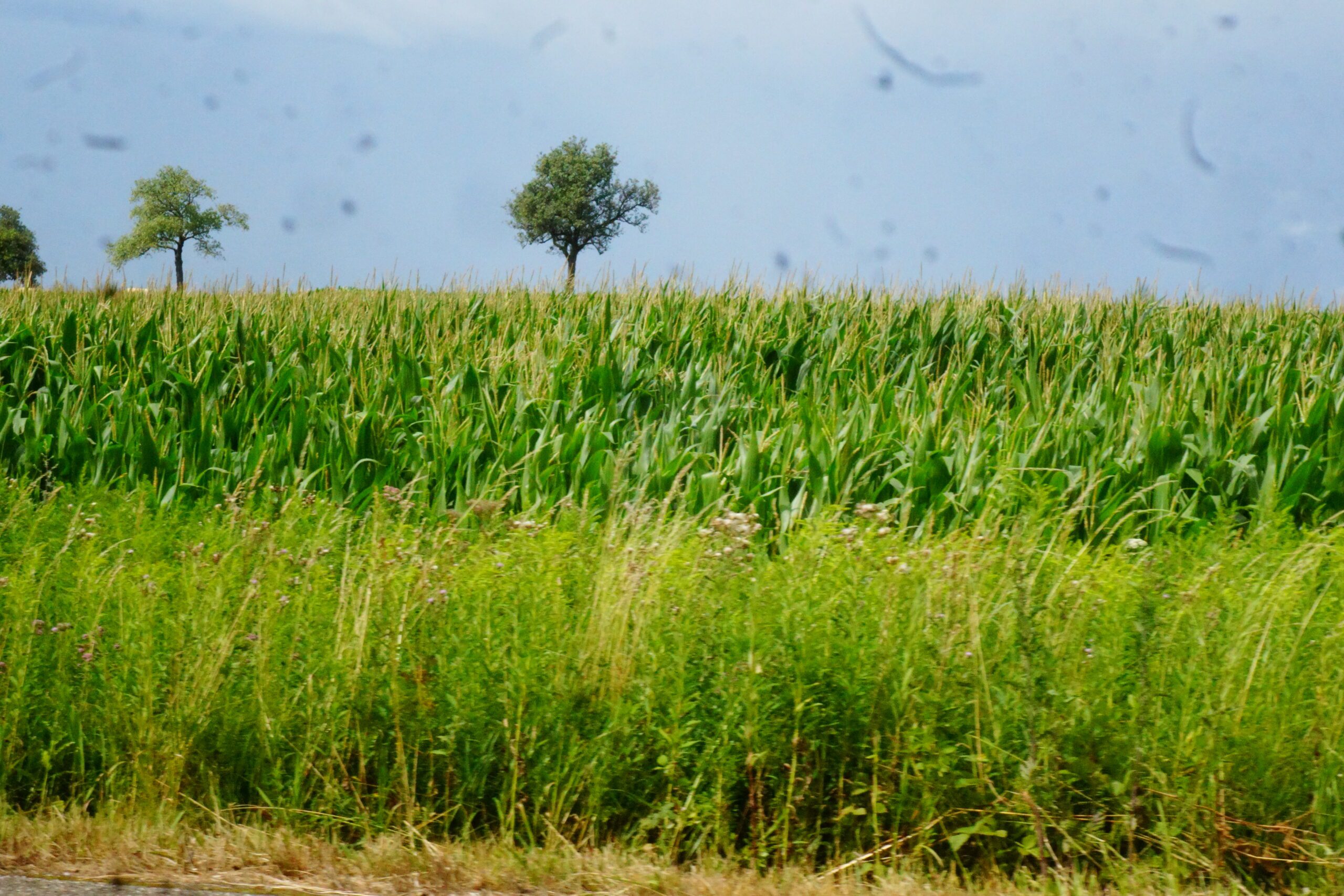 Vue d’avion, et ce n’est pas vraiment une blague, il n’y a qu’un seul champ de maïs qui couvre toute l’Alsace… il y a certainement de vertes allégations financières, industrielles, et même agricoles, disons qu’ici cette couleur verte n’est pas très écologique ! Pour la production de grains, pour le fourrage ou les semences, la terre alsacienne exploite son climat tempéré et personne n’ignore les pesticides excessifs, l’insuffisante rotation des cultures et l’épuisement des réserves d’eau. Et si chaque village était une voyelle ? U vert, sublimait Rimbaud. Les champs sont verts, les blés sont mûrs, les coquelicots sont épanouis récitait Victor Hugo.