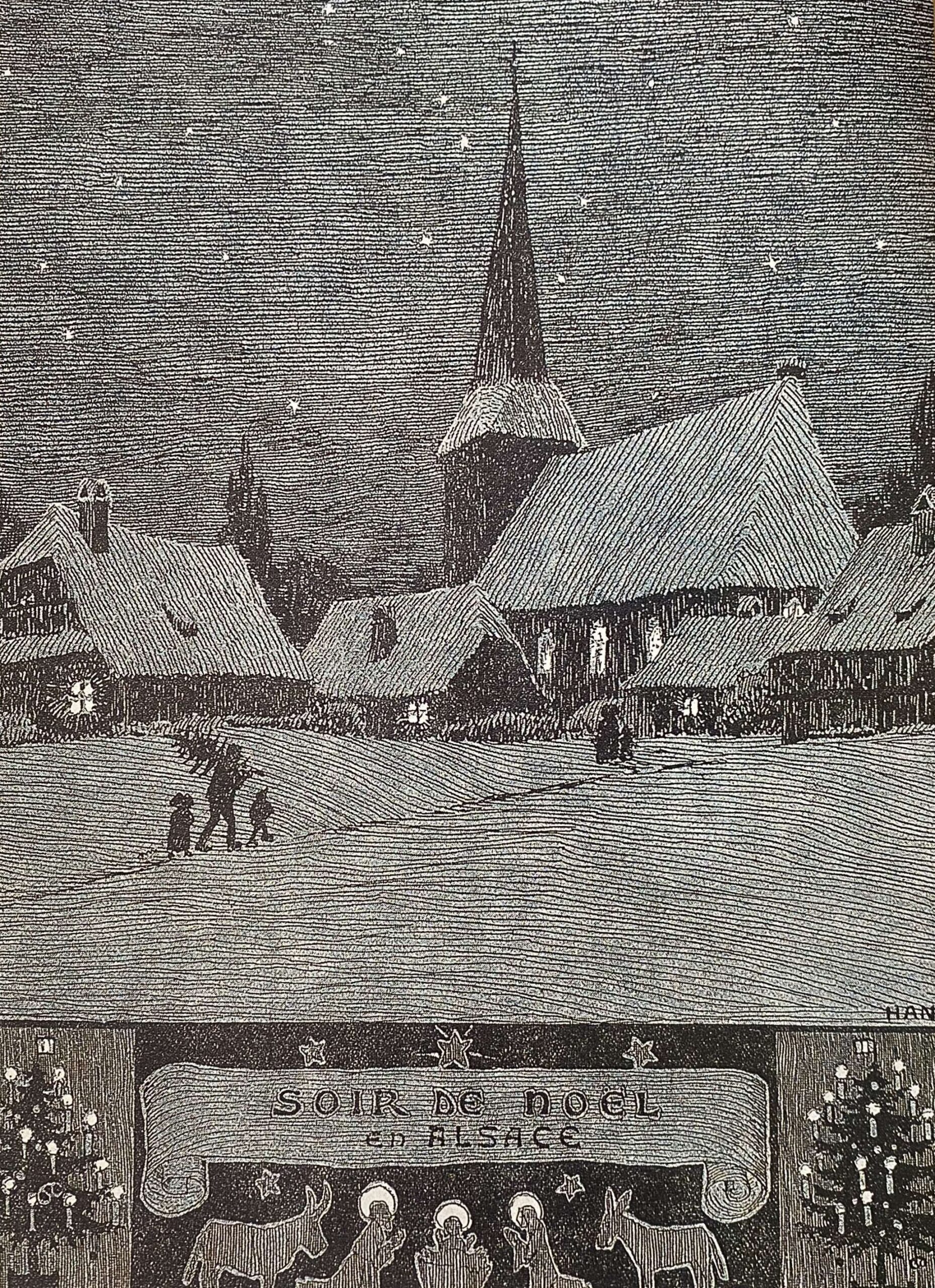 Ce dessin contient la douceur de Noël telle que je l’ai ressentie dans mon enfance et telle que je la cherche aujourd’hui encore. Cette illustration de Hansi me dit ce que la fête devrait revêtir en simplicité. Il y a ce paysage enneigé traversé par un homme portant un sapin, accompagné d’enfants, précédés par une femme. Il fait nuit et ils vont vers la chaleur d’une maison éclairée dans laquelle ils feront entrer de la verdure. Le sapin, symbole de la vie qui renaît avec le printemps, rassurait il y a des siècles déjà, à l’approche du solstice d’hiver où les nuits longues faisaient craindre à ceux qui nous ont précédés que peutêtre la lumière ne reviendrait pas.