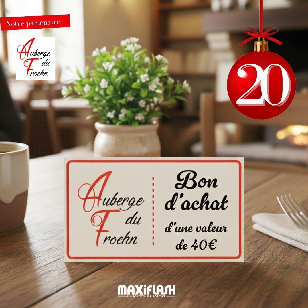 AccueilJeux concoursMaxi Calendrier de l'Avent - Case N°20 : Gagnez 1 bon d'achat... Maxi Calendrier de l’Avent – Case N°20 : Gagnez 1 bon d’achat d’une valeur de 40€ avec notre partenaire Auberge du Froehn. Par Maxi Flash 20 décembre 2025 0 13 Partager FacebookTwitterPinterestWhatsApp 1 Step 1 Maxi Calendrier de l'Avent - Case N°20 : Gagnez 1 bon d'achat d'une valeur de 40€ avec notre partenaire Auberge du Froehn. Votre nom Votre prénom Pseudo Facebookvotre nom complet Courrielun courriel valideemail Votre mobilenuméro de tel. Votre commune Votre code postal J'accepte de recevoir les dernières actualités du journal Maxi Flash par mailOuiNon J’accepte les conditions de participation et les mentions légalesOuiNon Envoyer keyboard_arrow_leftPrevious Nextkeyboard_arrow_right FormCraft - Générateur de formulaires WordPress Les gagnants seront contactés sur Facebook Pour consulter les mentions légales cliquez ICI Partager FacebookTwitterPinterestWhatsApp Article précédentCaroline Furstoss fait renaître la Salle des Fêtes ARTICLES SIMILAIRES Jeux concours Maxi Calendrier de l’Avent – Case N°19 : Gagnez 2 découpes aluminium « Cigognes » Taille M avec notre partenaire FIB Gensbittel. 19 décembre 2025 - Publicité - LES PLUS POPULAIRES Sylvaine Queffélec chouchoute les parents et les enfants 4 mars 2024 Sigolsheim – Thierry Speitel-Gotz, de la politique à l’hôtellerie de luxe 6 janvier 2025 Yves Hemedinger – A l’assaut de la montagne 22 janvier 2024 Stosswihr – Des tartes flambées comme à la maison 4 mars 2024 Afficher plus - Publicité -