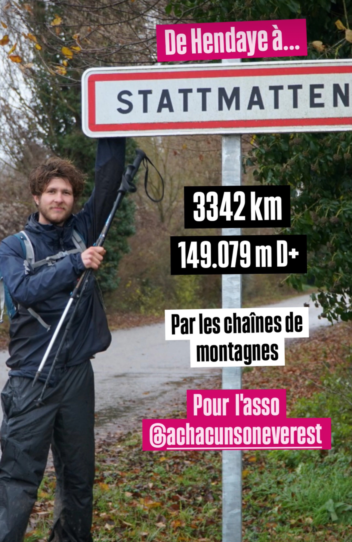 Le 6 décembre, Yoann a atteint le terminal nord de cet itinéraire extrême, situé entre Wissembourg et Schweigen (Allemagne). En plus d’être sportif, ce défi était aussi humanitaire. Durant tout son périple, le jeune marcheur soutenait les actions de l’association À chacun son Everest, qui accompagne des enfants atteints de cancer ou de leucémie, ainsi que des femmes en rémission du cancer du sein. L’association s’appuie sur la force du parallèle symbolique entre la difficulté de l’ascension d’un sommet et celle du chemin vers la guérison. Pour cette belle cause, Yoann est parvenu à récolter plus de 6 500 €. Cette somme permettra de financer des séjours d’accompagnement à davantage d’enfants et de femmes atteints de cancer.