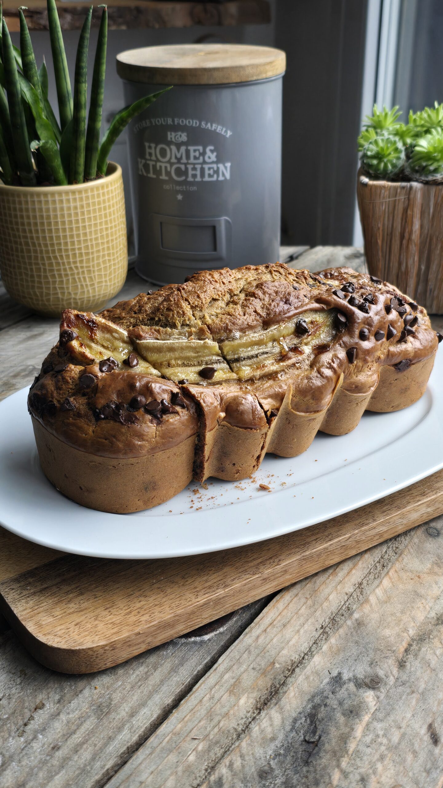 Coupez la dernière banane dans le sens de la longueur et déposez-la joliment sur le cake avec les pépites de chocolat restantes et enfournez pendant 50 minutes environ à 180°.
