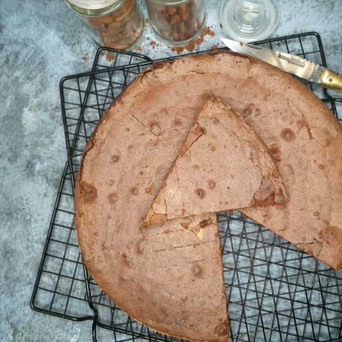 Incorporez le chocolat fondu et la fleur de sel, puis versez dans un moule de 22cm, préalablement beurré et fariné (ou chemisé d’une feuille de papier de cuisson).