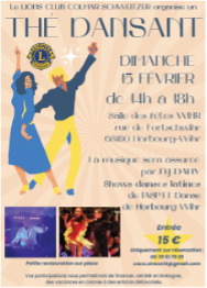 Le Lions Club Colmar Schweitzer organise un thé dansant avec spectacle de danses latines le dimanche 15 février de 14h à 18h à la salle Wihr à Horbourg-Wihr. L’animation sera assurée par DJ Dany avec les prestations de jeunes danseurs de l’ASPTT de Horbourg- Wihr qui virevolteront avec brio. Le bénéfice de ce thé dansant permettra de financer des vacances à la mer pour des enfants défavorisés.