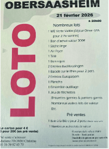 Comme chaque année, la société de quilles Avenir d’Obersaasheim organise son loto. De nombreux lots pour cette soirée sous le signe de la bonne humeur. 1 Weekend à la Verte Vallée, 1 bon d’achat de 300€, 1 sèche-linge, 1 air fryer, 1 Télé, 1 bon repas, 2 entrées Bad Krozingen, etc… Nous vous attendons nombreux.