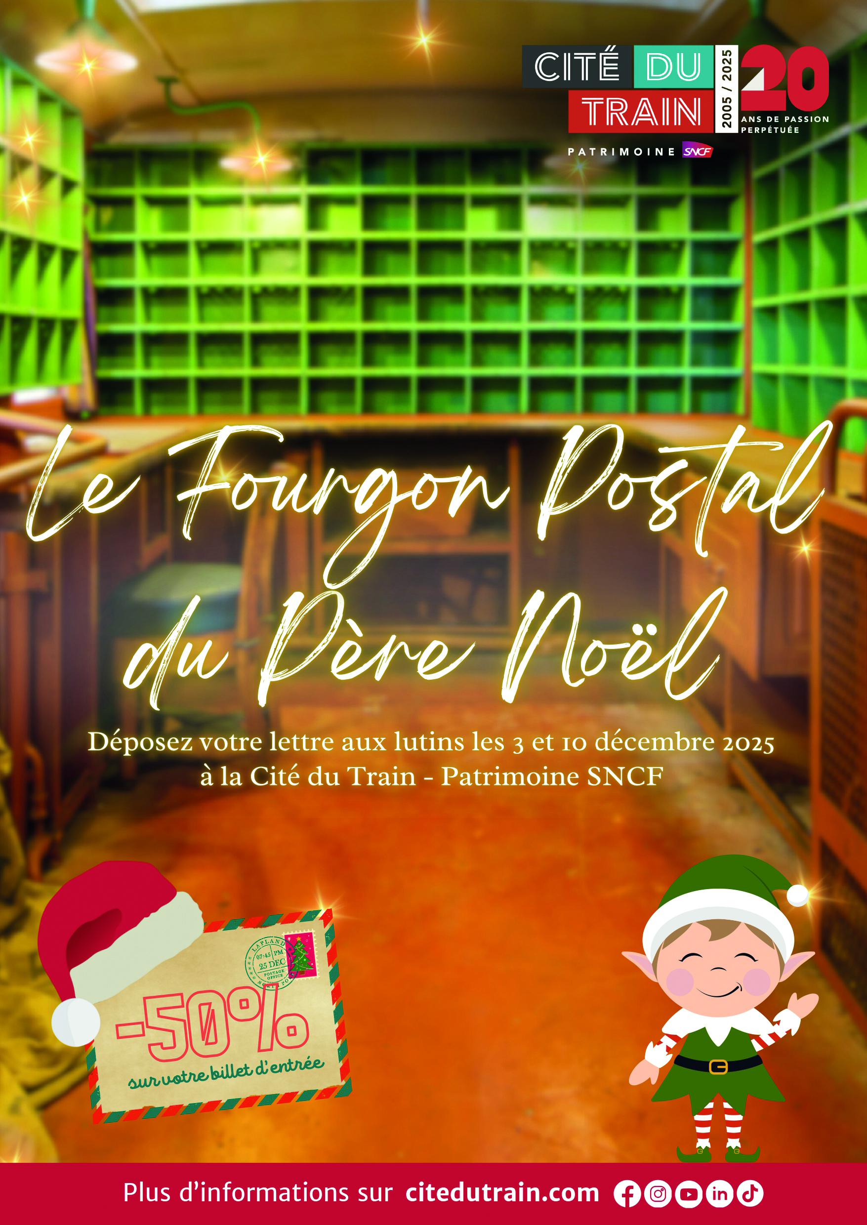 La magie de Noël revient à la Cité du Train ! Le Fourgon Postal du Père Noël accueille les lutins pour collecter et préparer les lettres des enfants à destination du Pôle Nord. Dans un décor féerique, chacun pourra remettre son courrier aux lutins.