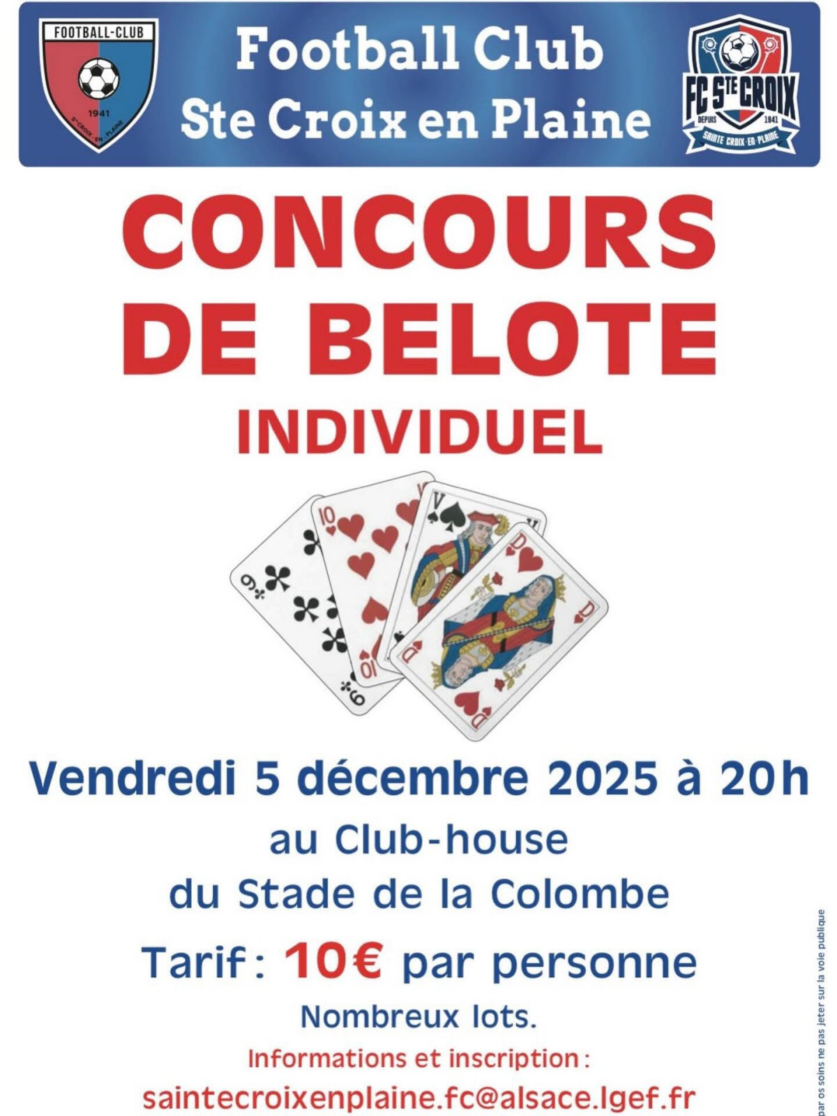 Le FC Sainte-Croix-en-Plaine vous invite à son grand concours de belote. Club House - Sainte-Croix-En-Plaine Venez tenter votre chance lors de notre concours de belote individuel ! 10 € par personne Nombreux lots à