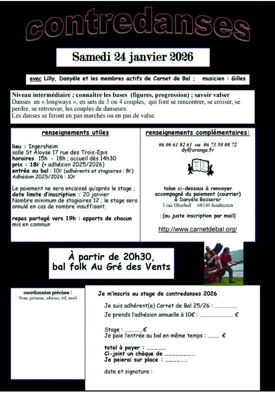 L’association Carnet de Bal organise un bal folk animé par le groupe Au Gré des Vents (folk d’Alsace et d’ailleurs). Le bal sera précédé de 15h à 18h (accueil dès 14h30) d’un atelier de contredanses, animé par Lilly, Danyèle, Gilles et toute l’équipe de Carnet de Bal.