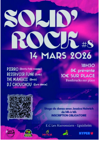 L’association Exa’Dépote organise la 8e édition du festival solidaire Solid’Rock à Eguisheim. Festival solidaire dont l’intégralité des bénéfices sera reversée à l’association Le Pélican. Au programme : 14h-16h : stage de