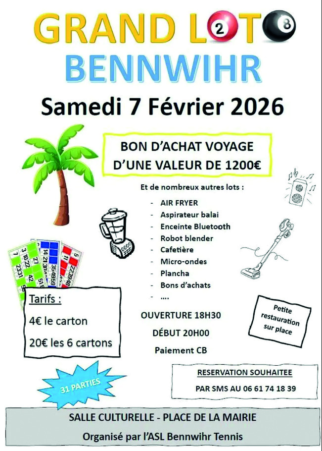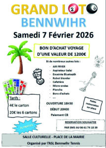 La section Tennis l’ASL Bennwihr vous invite à son premier loto ! Le 07 février 2026 à partir de 18h30. Ouverture des portes à 18h30, début du jeu 20h. 4€ le