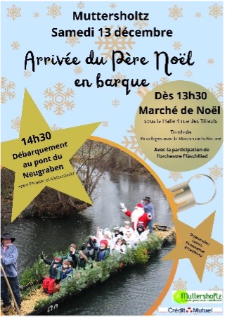 Le Père Noël a troqué son traineau et ses rennes contre un moyen de transport bien plus adapté au Ried et à ses inondations : la barque à fond plat. Le Batelier du Ried se fera un plaisir de le ramener à bon port. Le Père Noël, le Christkindel, les anges et les lutins, arrivent à Muttersholtz sur le Neugraben. Ils accosteront vers 14h30 au pont à la sortie de Muttersholtz en direction d’Ehnwihr. Petits et grands pourront saluer le gros bonhomme rouge. Le Père Noël et ses compagnons monteront dans la calèche pour rejoindre le centre du village, où se tiendra un Marché de Noël