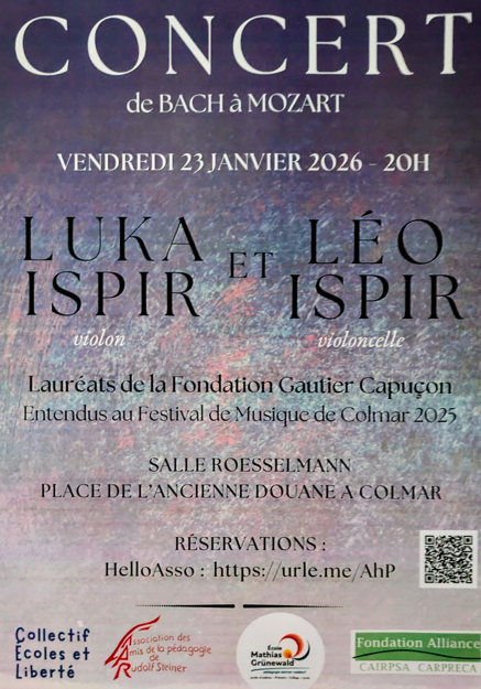 Le duo des frères LUKA & LÉO ISPIR, Lauréats de la Fondation Gautier Capuçon, entendus au Festival de la Musique de Colmar 2025, à nouveau réunis, à l’initiative du Collectif Écoles et Liberté et de l’Association des Amis de la Pédagogie de Rudolf Steiner.