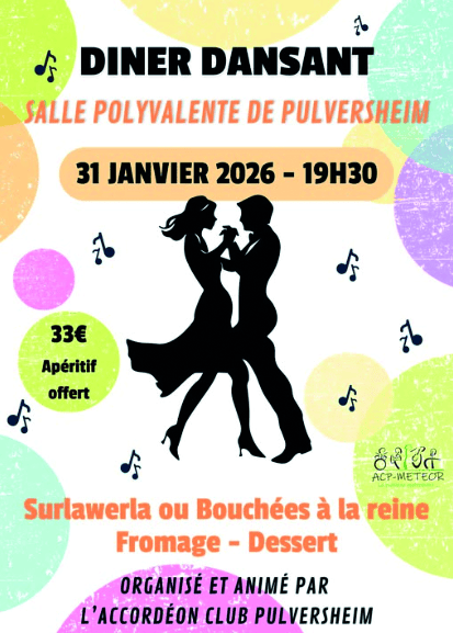 Une animation musicale assurée par nos musiciens qui vous feront danser jusqu’au bout de la nuit sur des rythmes de valse, marche, rock, madison ou encore musiques actuelles. Un repas au choix : Surlawerla ou Bouchées à la reine accompagnées de nouilles – Fromage – Dessert et café.