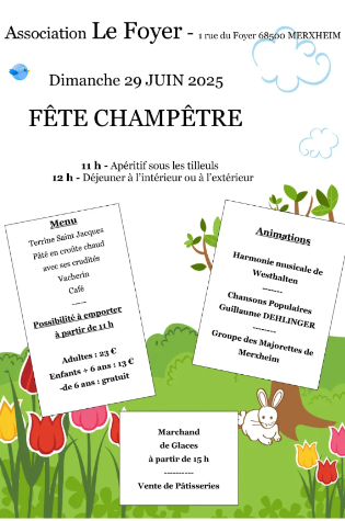 FÊTE CHAMPÊTRE Le 29 juin à Merxheim L’association LE FOYER organise sa traditionnelle Fête Champêtre le dimanche 29 juin dans son joli parc arboré de tilleuls, situé au centre du village. Le