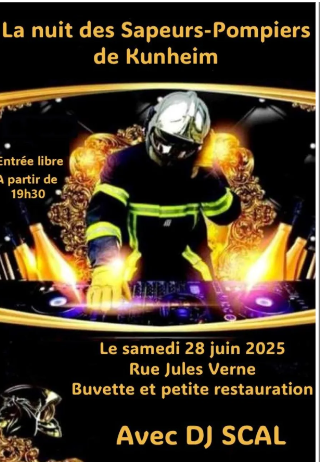 LA NUIT DES SAPEURS POMPIERS DE KUNHEIM Le 28 juin à Kunheim Le bal se déroulera place du tertre, derrière la salle des fêtes (ou à l’intérieur en cas de mauvais temps).