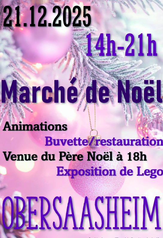 La commune d’Obersaasheim organise le marché de Noël des artisans. Tout au long de la journée les associations du village tiendront le stand buvette et restauration ainsi que les diverses animations proposées. Tous les bénéfices de cette journée leur sont reversés. Le père Noël viendra illuminer la fin d’après-midi (vers 18h) pour rencontrer petits et grands. Et grande nouveauté cette année : il y aura une exposition de Lego par des passionnés du village !